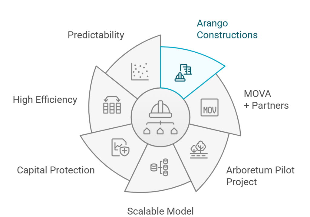 Arango Constructions manages capital and a specialized trade network, while MOVA provides the design intelligence from BIM and cost control to market strategy.